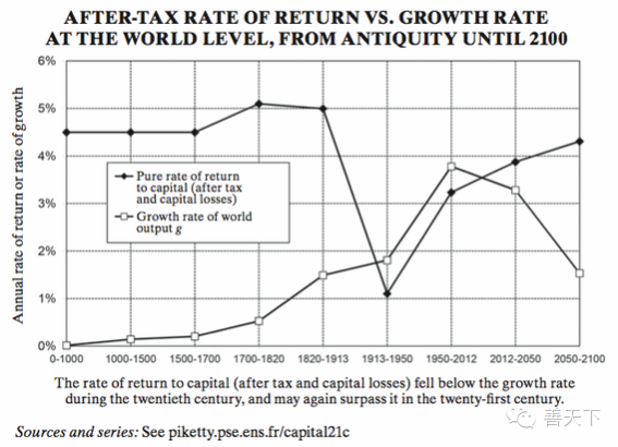 另一方面,金融市场的发展所带来的投资渠道的多样化和投资门槛的降低使得中产阶层的资本收入也在总收入中占据越来越重要的地位。“贫富”和“有无”之间一一对应的模糊化,使得r与g的差别对于实际贫富差距的影响大大缩小。此外,作者仅仅关注平均意义上的r和g,而现实中不同行业、地区、能力的人的工资水平和工资增长路径大相径庭。这本身就是收入差距的一大来源,而作者并未讨论。其实,在现代经济不断涌现的新兴产业中,工资增长率高于社会平均资本回报率的现象并不罕见。这一方面拉大了行业间的收入差距,而另一方面也可能缩小了相对有产和(一部分)相对无产者之间的距离。这种种值得玩味的现象并不是一个简单的不等式所能捕捉的了的。