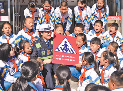 图为内蒙古扎兰屯市公安局交警大队民警在向辖区小学生讲解道路安全知识。丁志军 韩 冷摄影报道
