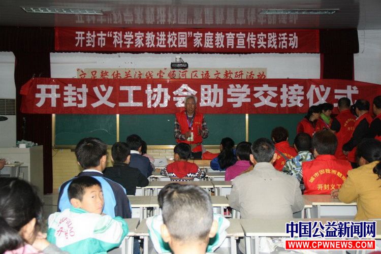 在各个交接点的仪式上,开封市义工协会的旗帜和交接仪式的条幅悬挂在黑板上,义工和孩子们亲切的交谈,要求孩子们努力学习,以优异的成绩报答社会,报答众多爱心人士的关心,义工王银娣还赠送每位孩子一本《弟子规》。在这些孩子中,大部分都是单亲家庭,甚至有的失去双亲,仅靠年迈的爷爷奶奶或其他亲属生活,或者因家中主要劳动力受重大伤残等原因造成家中经济困难。但是他们人穷志不短,学习成绩都在中上等以上,甚至名列前茅。开封市义工协会将他们列入帮扶对象,号召社会各界爱心人士伸出援助之手。三年多来,已有200多名爱心人士为孩子们捐款捐物,许多义工本身就是资助人。