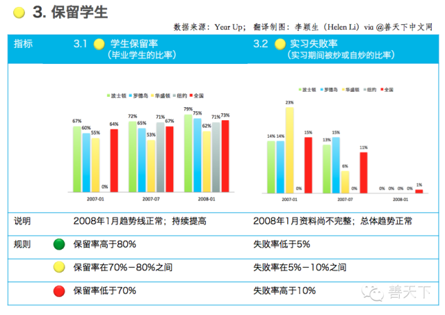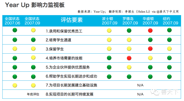 具体而言,在日常运营中,他们从8个方面来监测评价,以红、黄、绿评价项目执行状态。绿灯状态正常,黄灯状态警示,红灯状态需要立即纠正。2007年之后,Year Up引入了Salesforce.com的云服务,实现了数据即时监测评估,而且全国分支机构之间数据可以实时共享。