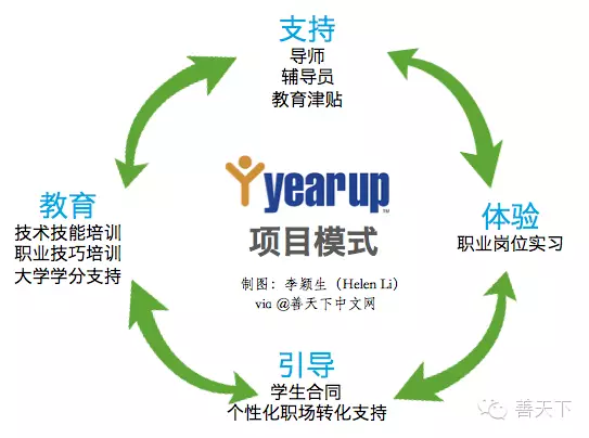 Year Up是美国创新社会企业,为18-24岁低收入家庭高危青年提供为期一年的职业培训及企业实习,帮助其实现职业焕新,获得奥巴马政府社会创新基金的资助。