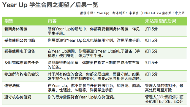 Year Up的服务对象中,很多人非常聪明,应付学业游刃有余,却常常栽倒在行为和态度上。Year Up通过合同的方式,把他们的态度、行为和可以度量的结果(扣分、扣钱)结合起来,帮助学生理解责任和锻炼担当,有效地促进了学生的行为改变。在合同执行过程中,他们也尽量公开、公正、透明。