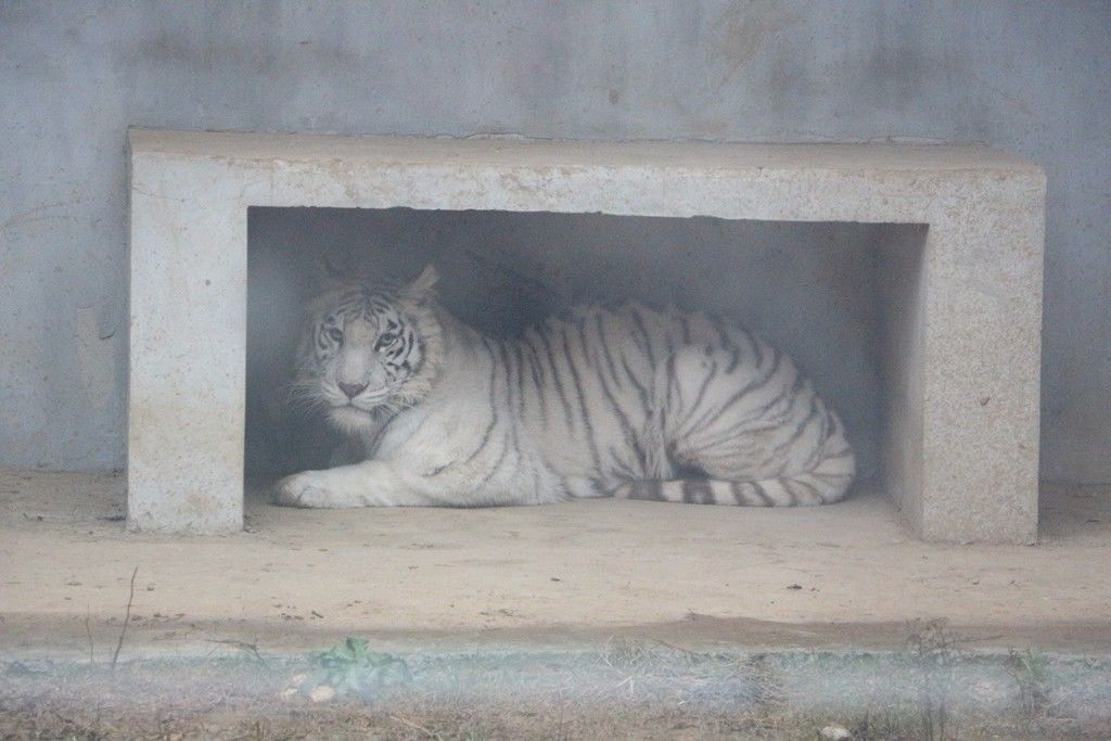 武汉动物园现有8只老虎,7只东北虎和1只母白虎。这只白虎是去年从宁波引进的,属于孟加拉虎的一种,今年7岁,现体重约120公斤。视频中白虎四肢趴下后,腿部骨骼凸起,显得瘦,站起来其实并不瘦。目前白虎食欲佳、精神状态良好。