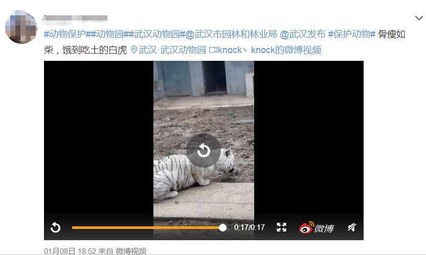 “当时还有其他朋友在场,也都拍下了老虎吃土的视频。”王先生说,因为赶时间,周围也没有看到工作人员,他们并没有及时向园方反映,昨晚发了微博,@了武汉动物园、动物保护、武汉发布。