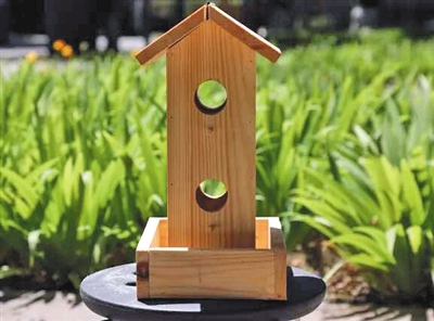 鸟食台:用以招引鸟类的“小木屋”,冬季可给鸟类提供食物和饮水。设立鸟食台需根据不同鸟类的生态习性选择合适的地点和食物,同时,安装位置距离地面要有一定高度,以防野猫等“突袭”。