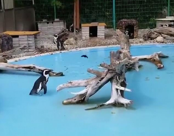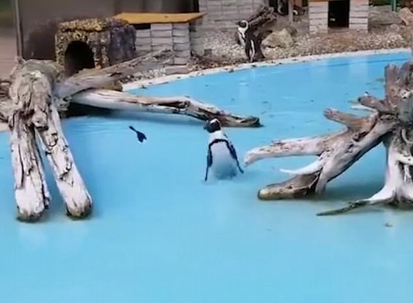 视频中,这只企鹅发现了一只蝴蝶后,开始追它。为了追到这只蝴蝶,它双腿快速摆动,一次又一次地绕着水池,用最快的速度去追赶。