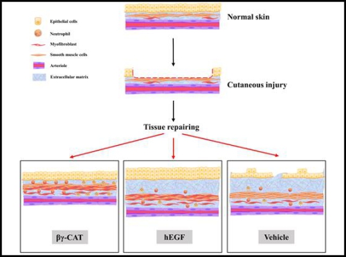 中国科学院昆明动物研究所生物毒素与人类疾病课题组研究员张云团队前期从云南两栖动物大蹼铃蟾中发现了脊椎动物第一个新型孔道形成蛋白和三叶因子复合物betagamma-CAT(发明专利ZL200810058028.5;PLoS One, 2008, 3, e1770),并发现该内源性蛋白质机器具有刺激细胞囊泡化生成,在细胞内吞/溶酶体中形成膜通道并调控其功能的特性(Proc Natl Acad Sci USA 2014,111,6702,封面故事;J Infect Dis 2017, 215, 1753)。近日,该课题组高振华等进一步深入揭示该复合物具有激发组织修复的功能。与目前临床上广泛使用的表皮生长因子EGF相比,该复合物不仅可以通过加快皮肤组织损伤的再上皮化来促进伤口愈合,还具有减轻创伤水肿,促进无疤痕愈合,同时抵御耐药菌感染的特征。该研究发现了脊椎动物组织创伤修复的未知蛋白质效应分子复合物及新型细胞作用通路,为深入解析组织再生和修复及疤痕形成的分子病理机制提供了新思路和新线索,对研发新的疾病治疗药物具有实际应用意义。