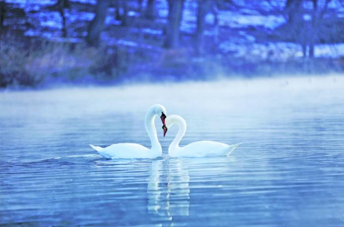 由于这里天然泉眼密集,湖水来自地下温泉,即使在最寒冷的冬季也不结冰,不仅给天鹅越冬创造了优越的条件,也是一处集动植物景观、湿地景观、水系景观于一体的风景绝佳之地,更是一片原始静谧的人间净土。每到冬季,升腾的水汽把岸上的树装扮成玉树琼花,雾凇间民居错落有致,白色精灵如点点白帆般游弋其中——冰、雪、雾凇、天鹅、民居,这一切让天鹅泉美得如梦如幻。