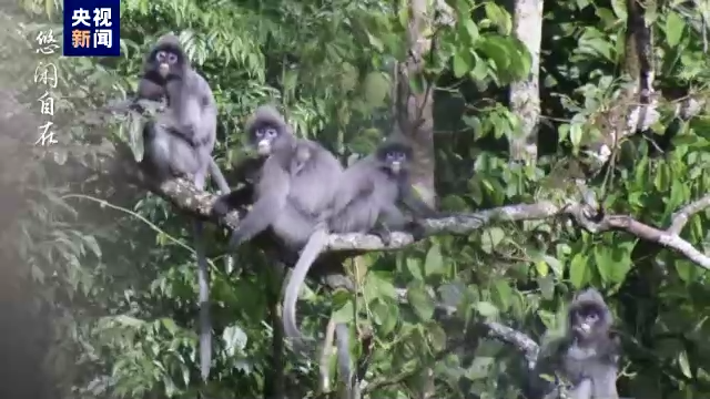 画面中,印支灰叶猴拖着长长的尾巴,悠闲地坐在树干上,时而四处张望,时而追逐嬉戏、上蹦下跳,时而又到处采食野果,猴宝宝们则躺在妈妈怀里,尽情享受着夏日的暖阳。