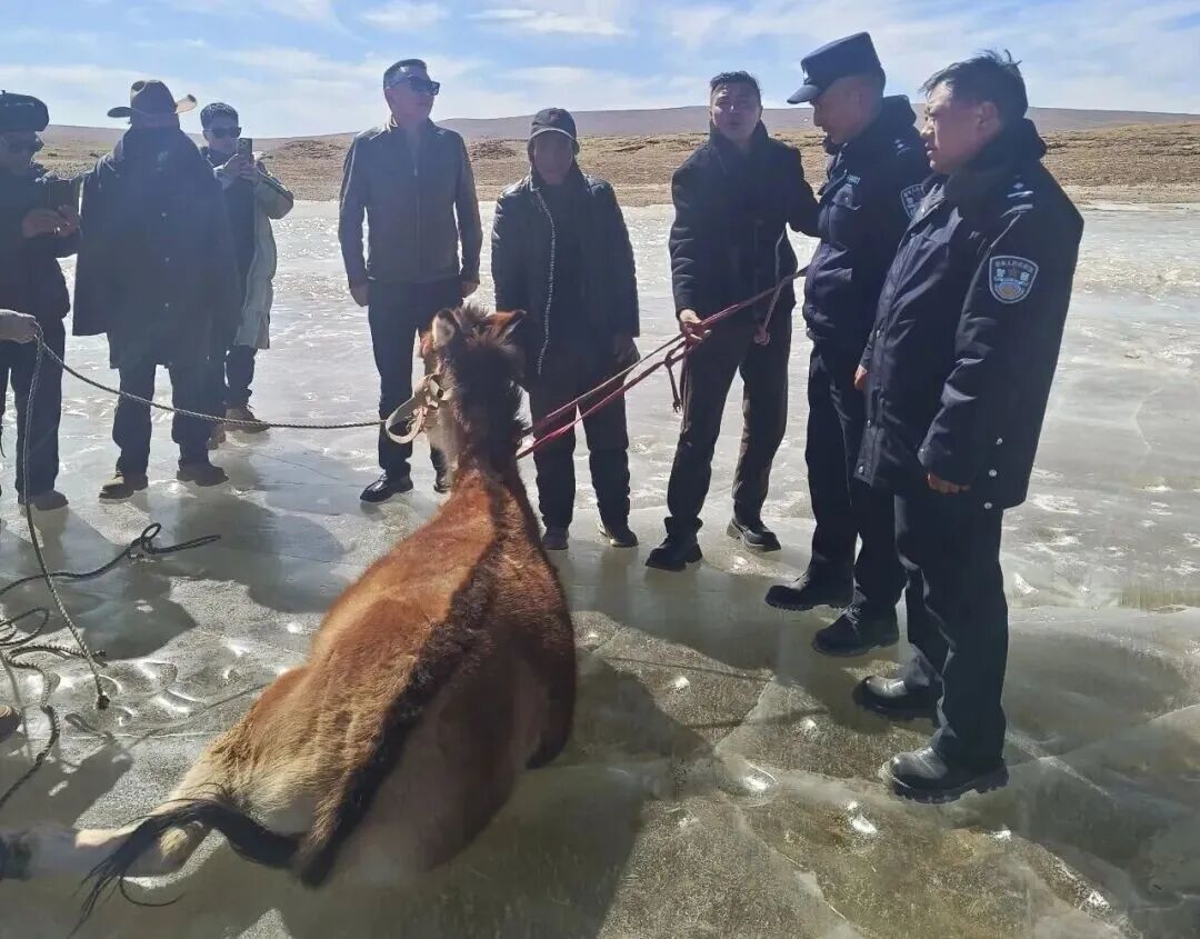 近日,青海省玉树州杂多县公安局环食药侦大队救助了受伤的藏野驴,该藏野驴因腿部受伤被困冰面,后经检查藏野驴伤情无大碍后放归野外。