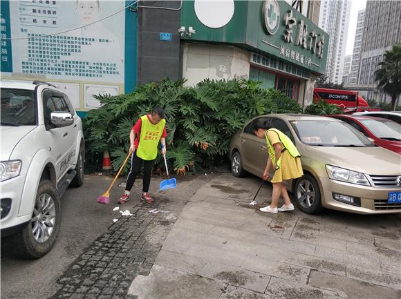 社区干部、志愿者正在清理街边垃圾。通讯员 邓怡 摄