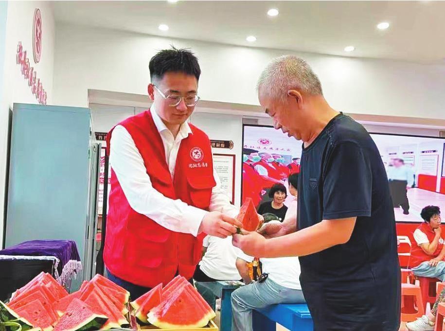 在沈阳市牡丹社区,工行志愿者为社区内行动不便的老年人提供上门“义剪”“磨剪子戗菜刀”服务。图为社区老人们吃着志愿者带去的西瓜,纷纷对贴心服务点赞。赵博璐 摄
