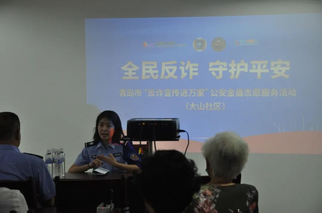 ;为持续营造“全民反诈、守护平安”的浓厚氛围,不断增强人民群众的识诈防诈能力,8月18日,由青岛市公安局、青岛公安金盾志愿服务队、中国光大银行青岛分行主办,青岛市公安局市北分局、大山社区居委会、青岛新闻网承办的青岛市“反诈宣传进万家”公安金盾志愿服务活动走进大山社区,警、企、媒多方携手,预防和减少电信诈骗案件的发生。