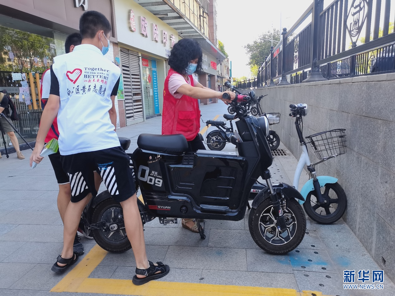 志愿者对巡查中发现倒伏、违规停放的共享单车扶正规整。何家贵摄。新华网发