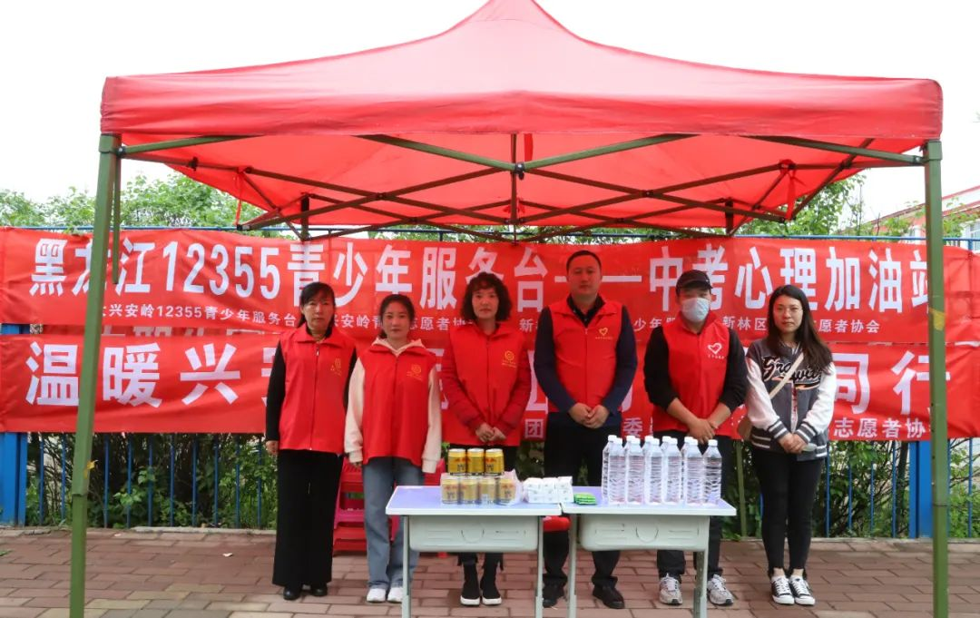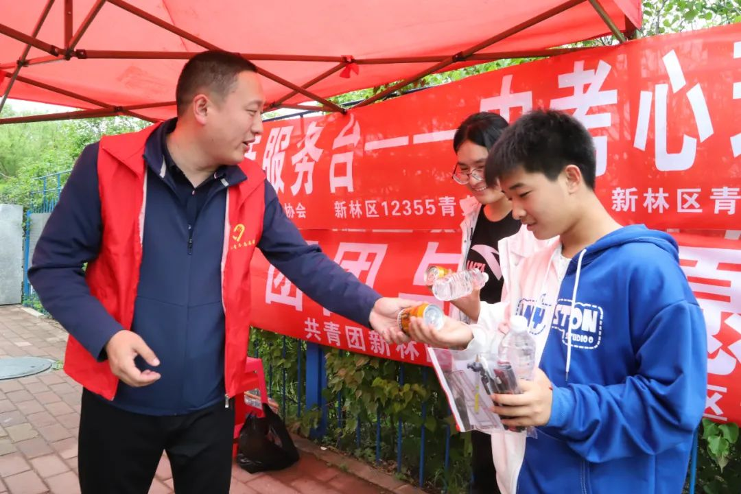 6月25日,团区委、区退役军人事务局的志愿者们来到新林二中考点门口,设置志愿服务点,悬挂“温暖兴安·团团与志愿同行”“黑龙江12355青少年服务台——中考心理加油站”条幅,配合学校维持考场周围环境秩序。志愿者们个个面带微笑,为考生免费发放矿泉水、红牛饮料、面巾纸、湿巾等物品,并为其加油鼓劲送去祝福。同时,现场为在外焦急等待的考生家长进行心理疏导,提供临时休息场所。