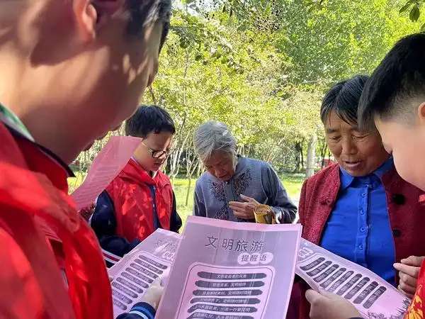 为进一步弘扬文明旅游风尚,践行文明新风,提升广大青少年文明旅游意识,在全社会营造良好的旅游环境,9月24日,济源市沁园路小学六(4)班的志愿者们在班主任严晓丽老师的带领下,一起走进沁园社区开展“文明旅游我先行 共绘城市好风景”宣传志愿服务活动。