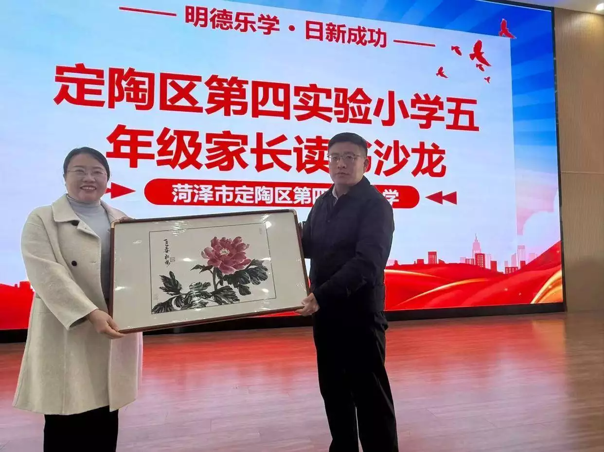 活动尾声,学校向杨盛林讲师赠送了一幅寓意高雅的牡丹花作品,以表达诚挚谢意,并象征家校共育如花开满园、芬芳四溢。