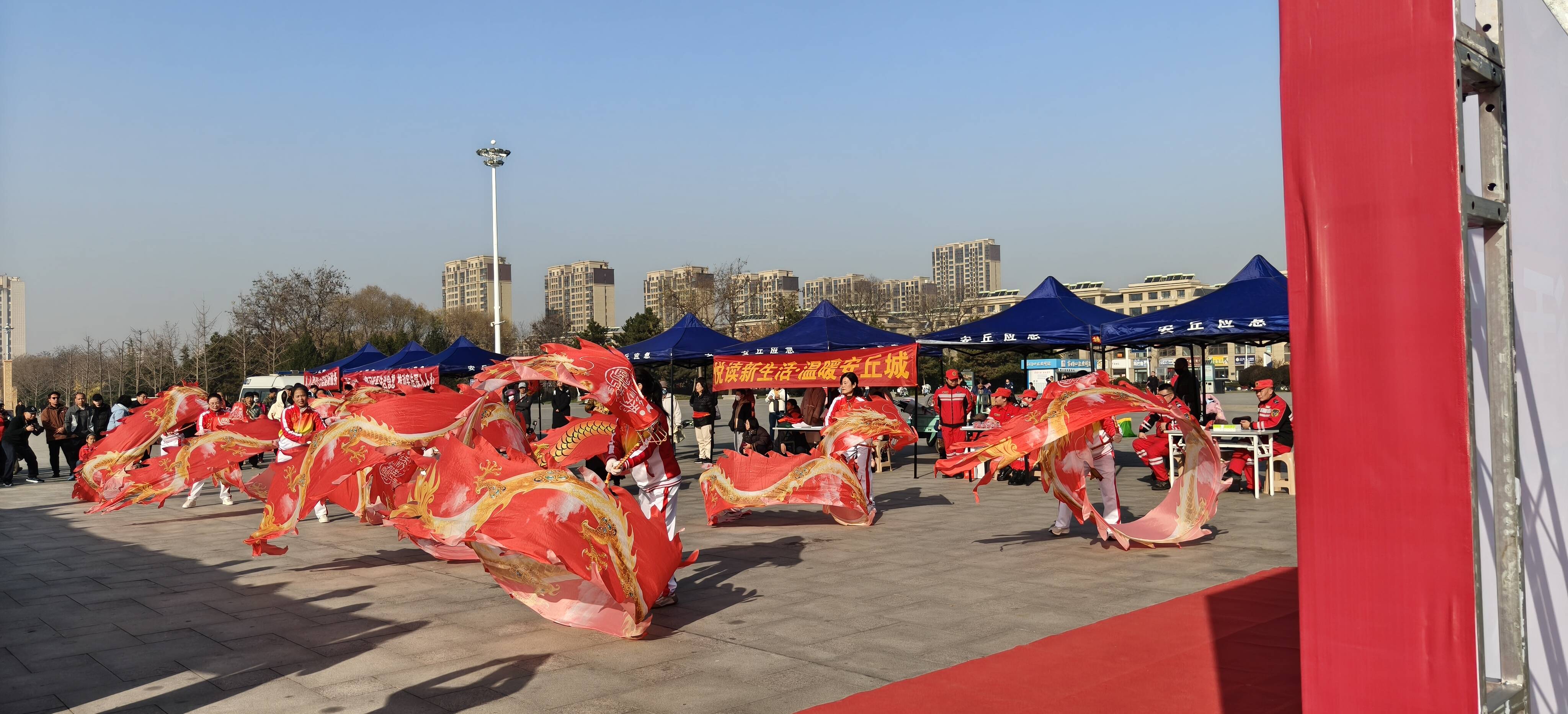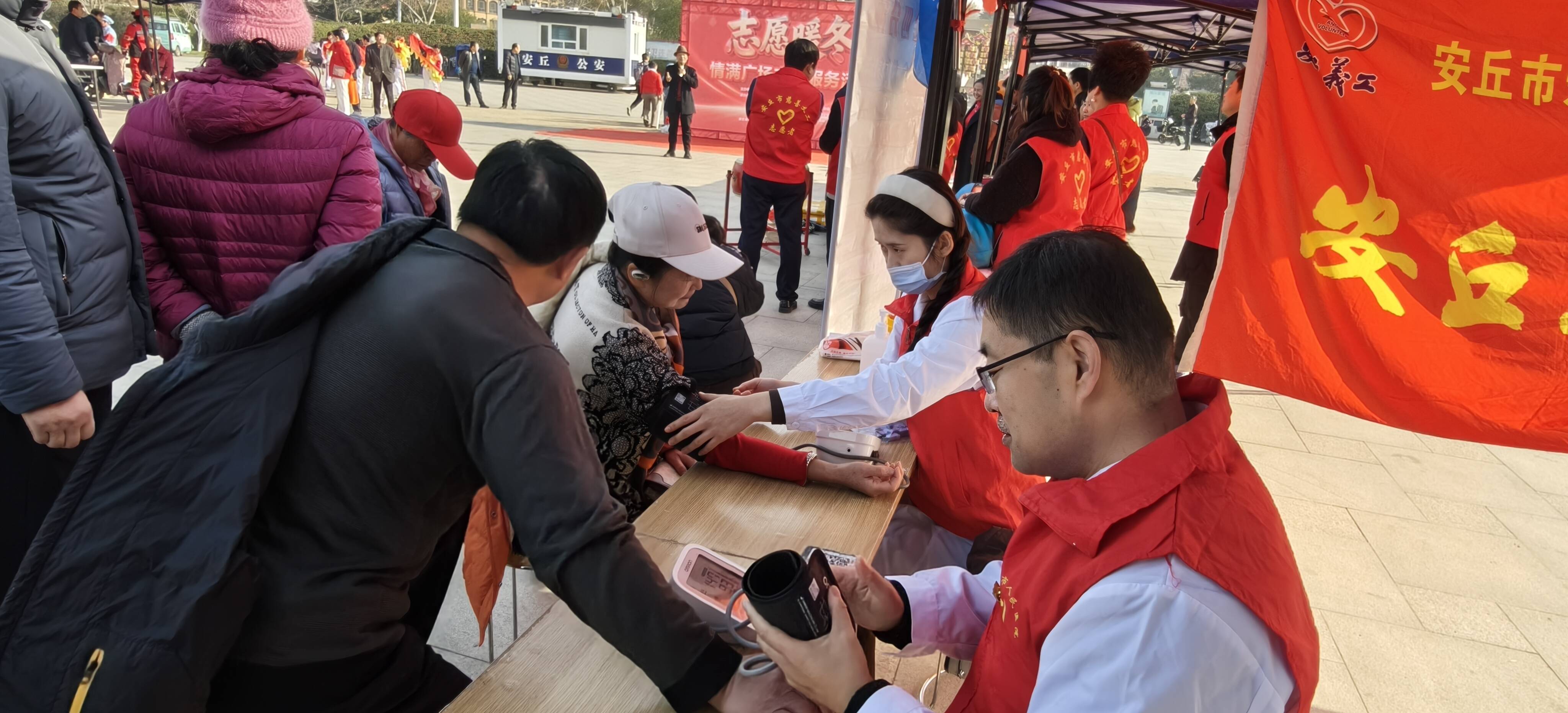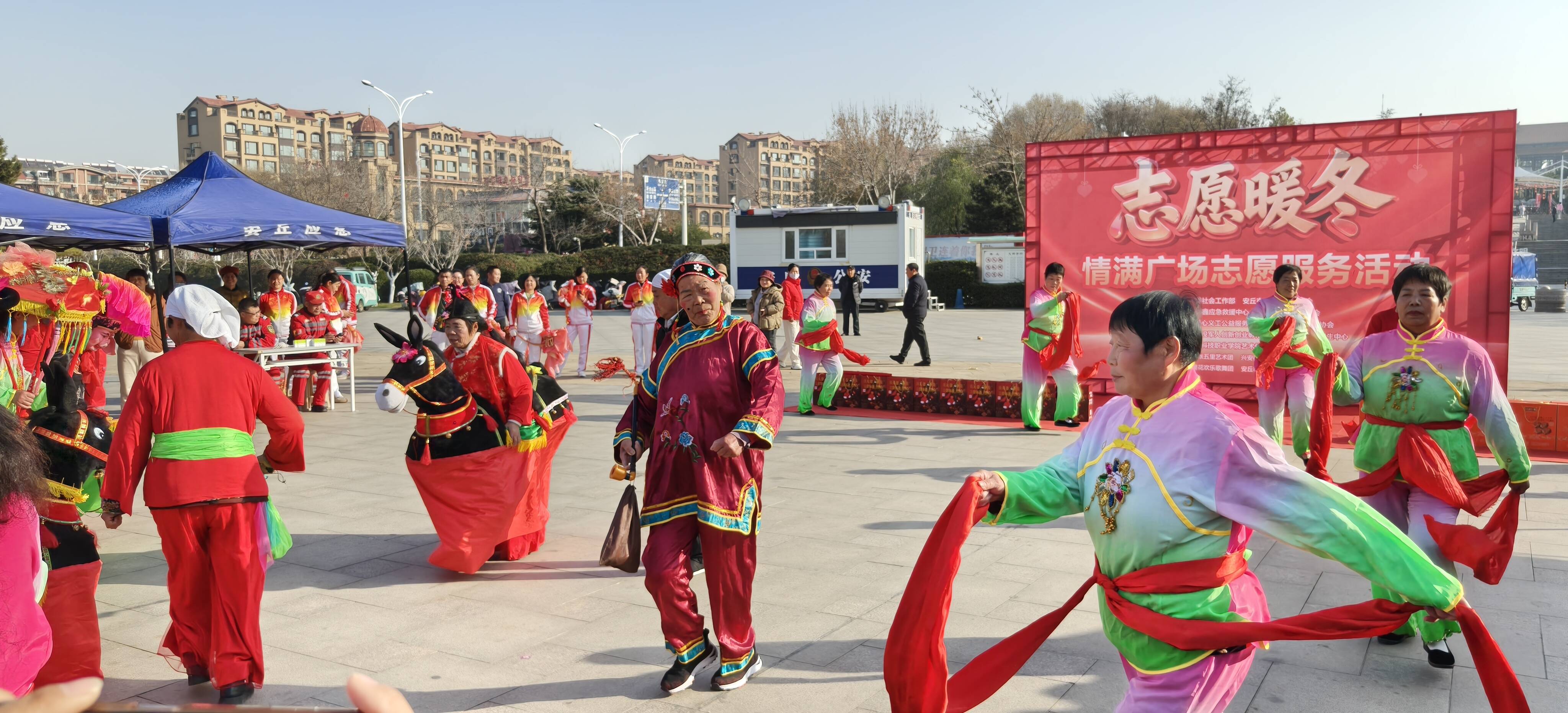 来自兴安街道张五里艺术团、兴安街道郝家庄歌舞队、五星花欢乐歌舞团和安丘市健身鞭协会的志愿者们表演了大秧歌、歌曲、舞蹈、情景剧等丰富多彩的文艺节目。安丘市慈善义工协会的志愿者们手把手地指导市民进行心肺复苏操作。安丘市爱心义工公益服务中心的志愿者们进行健康调理、公益理发等,并联合市人民医院进行义诊查体。安丘市浩鑫应急救援中心举行了关爱老人防走失手环赠送、眼药水赠送活动。潍坊食品科技职业学院艺术传媒学院志愿服务队身着统一“志愿红”服装积极参与,以预防艾滋病宣传为核心开展特色服务,用青春力量为冬日增添温情。大家用多样服务为寒冷冬日增添暖意,吸引了众多市民驻足参与。