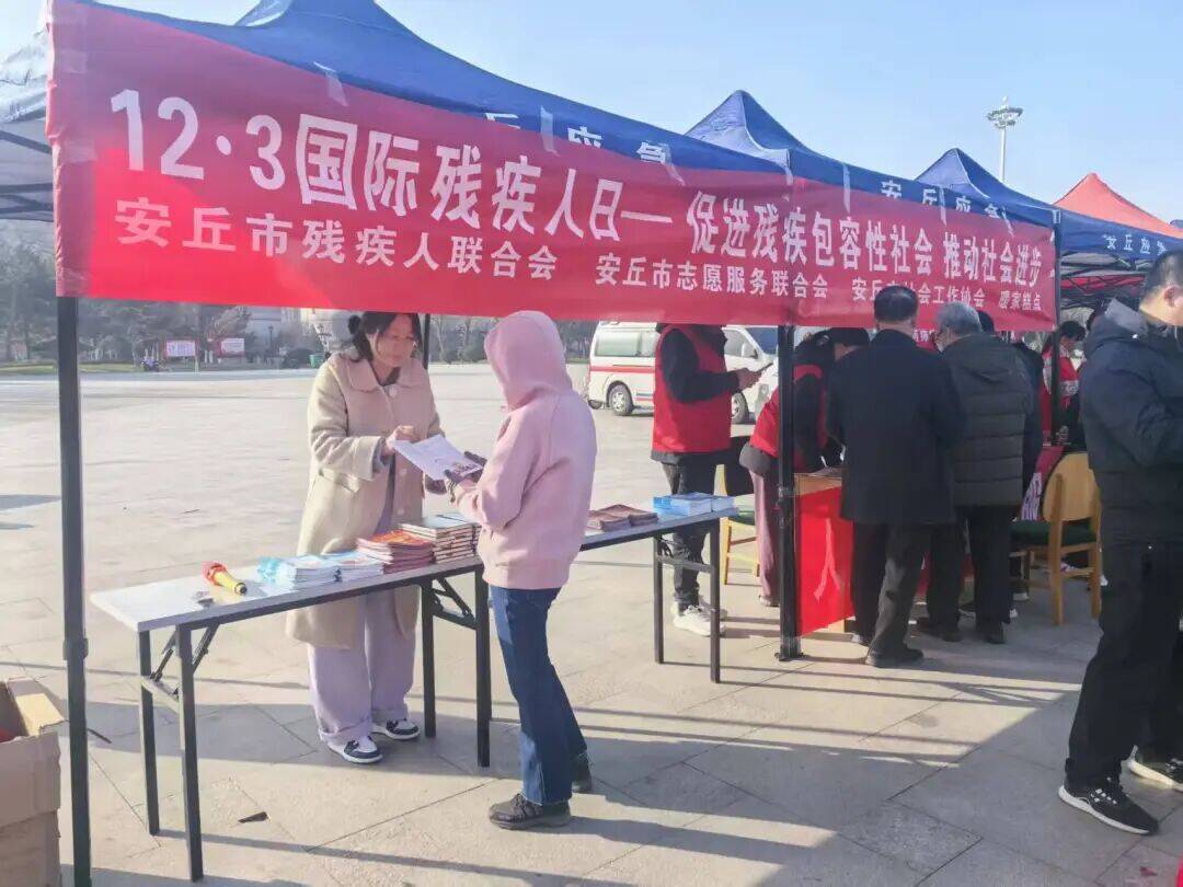 活动现场暖意融融,各类服务点位有序排布。安丘市残疾人联合会以“12.3国际残疾人日——促进残疾包容社会 推动社会进步”为主题向市民宣传惠残政策,解答群众疑虑。